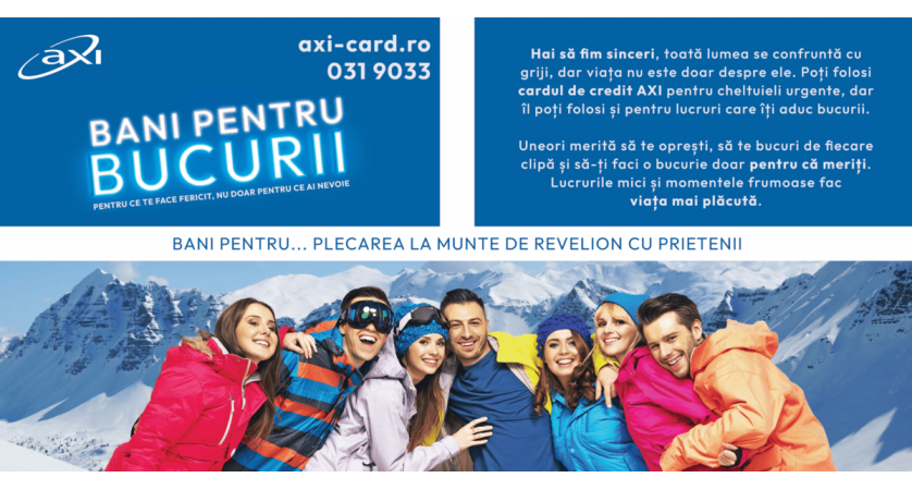 AXI Card lansează, în perioada 1 noiembrie - 15 decembrie 2025, campania „Bani pentru Bucurii”, prin care utilizatorii cardului de credit AXI pot câștiga unul dintre cele 13 premii tip „al 13 lea salariu”, în valoare de 4.050 lei fiecare, echivalentul salariului minim brut pe economie. Fiecare tranzacție de minimum 500 lei efectuată cu cardul AXI, la POS sau online, intră automat în extragerea promoției, iar premiile vor fi virate până la 23 decembrie 2025.