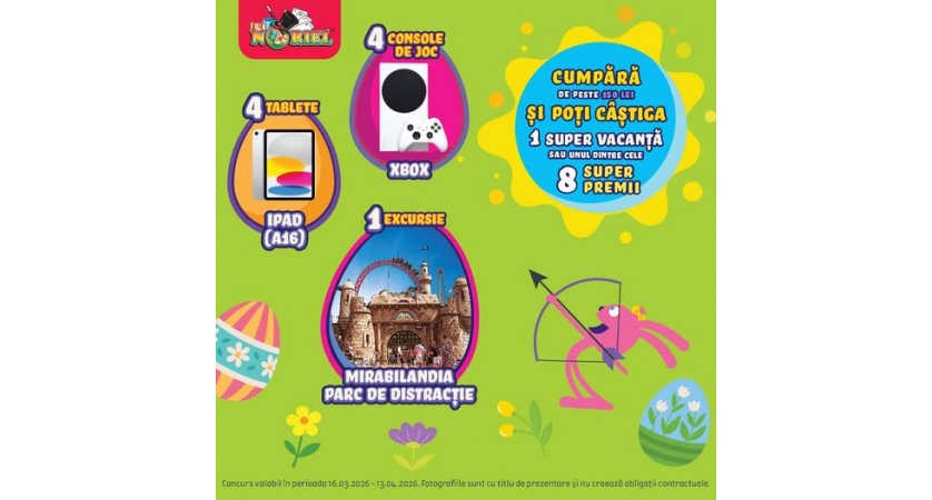 Cumpara produse de minimul 150 lei inscrie bonul pe noriel.ro pana pe 13 aprilie 2026 si poti castiga vacanta de vis la Mirabilandia sau unul dintre cele 8super-premii: 4 tablete Apple iPad + 4 console Xbox.