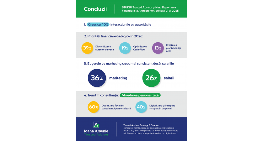 „Studiul din acest an Raportarea Financiara la Antreprenori, editia a VI-a, arata preocuparea antreprenorilor sa genereze business mai mult, ideal cu aceleasi resurse, si pentru a acoperi cresterile de taxe si a conserva valoarea banilor investiti. Estimam ca anul 2026 va fi dificil pentru antreprenorii care nu au anumite rezerve, capitalizare si cash, si suntem precauti, alaturi de ei, in previziuni de crestere reala a businessului”, explica Ioana Arsenie, Fondator TRUSTED Advisor Strategy & Finance si strateg financiar.