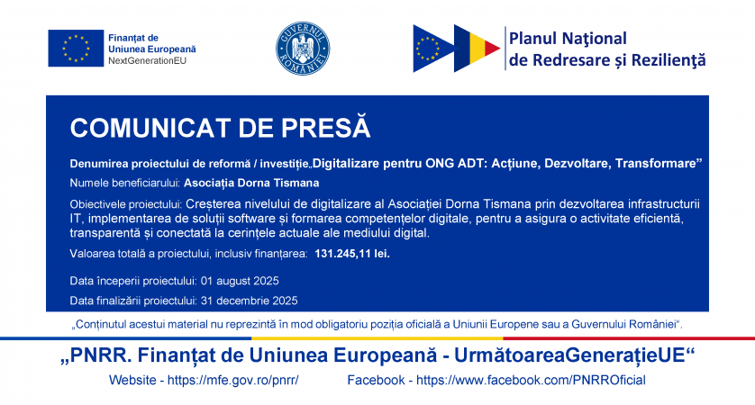 Asociatia Dorna Tismana (CIF 29507614) implementeaza proiectul „Digitalizare pentru ONG ADT: Actiune, Dezvoltare, Transformare”, finantat prin Planul National de Redresare si Rezilienta (PNRR), Componenta C7 – Transformare digitala, Investitia I.9 – Digitalizarea ONG-urilor, apelul „Sprijin pentru digitalizarea organizatiilor neguvernamentale”.