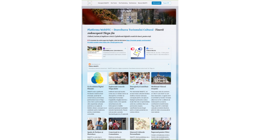 WebDTC.ro este o platforma digitala interactiva care sprijina tinerii in descoperirea si promovarea patrimoniului cultural al orasului. Platforma reuneste resurse educationale, harti culturale si instrumente utile pentru initierea de proiecte locale.